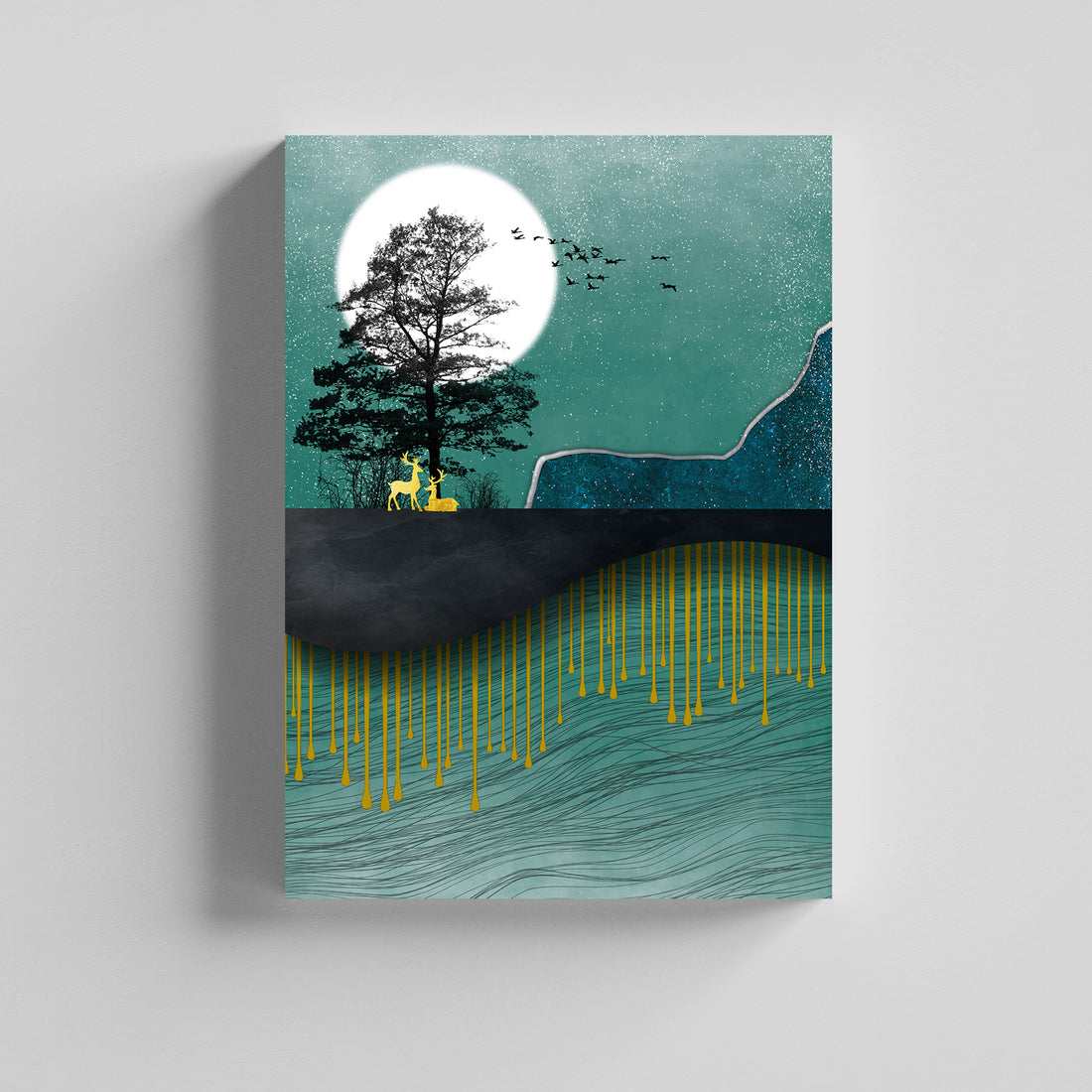 Golden Stillness Canvas Painting features a radiant golden tree set against a deep midnight-blue backdrop,...
