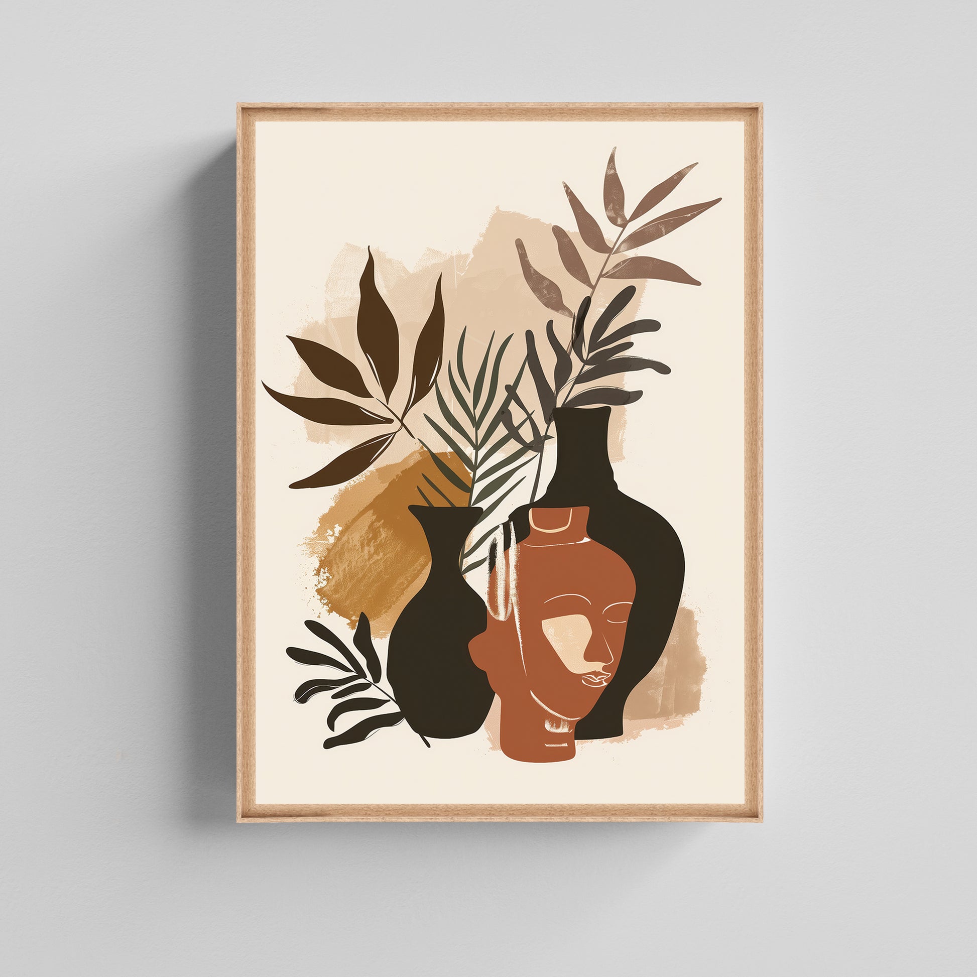 Elevate your interior décor with this Abstract Face & Botanical Wall Art Canvas, a modern artistic blend of sculptural vases, abstract human face, and organic leaf elements. Designed in warm earthy tones like terracotta, beige, brown, charcoal, and soft cream, this artwork brings a calm yet expressive aesthetic to any space.
