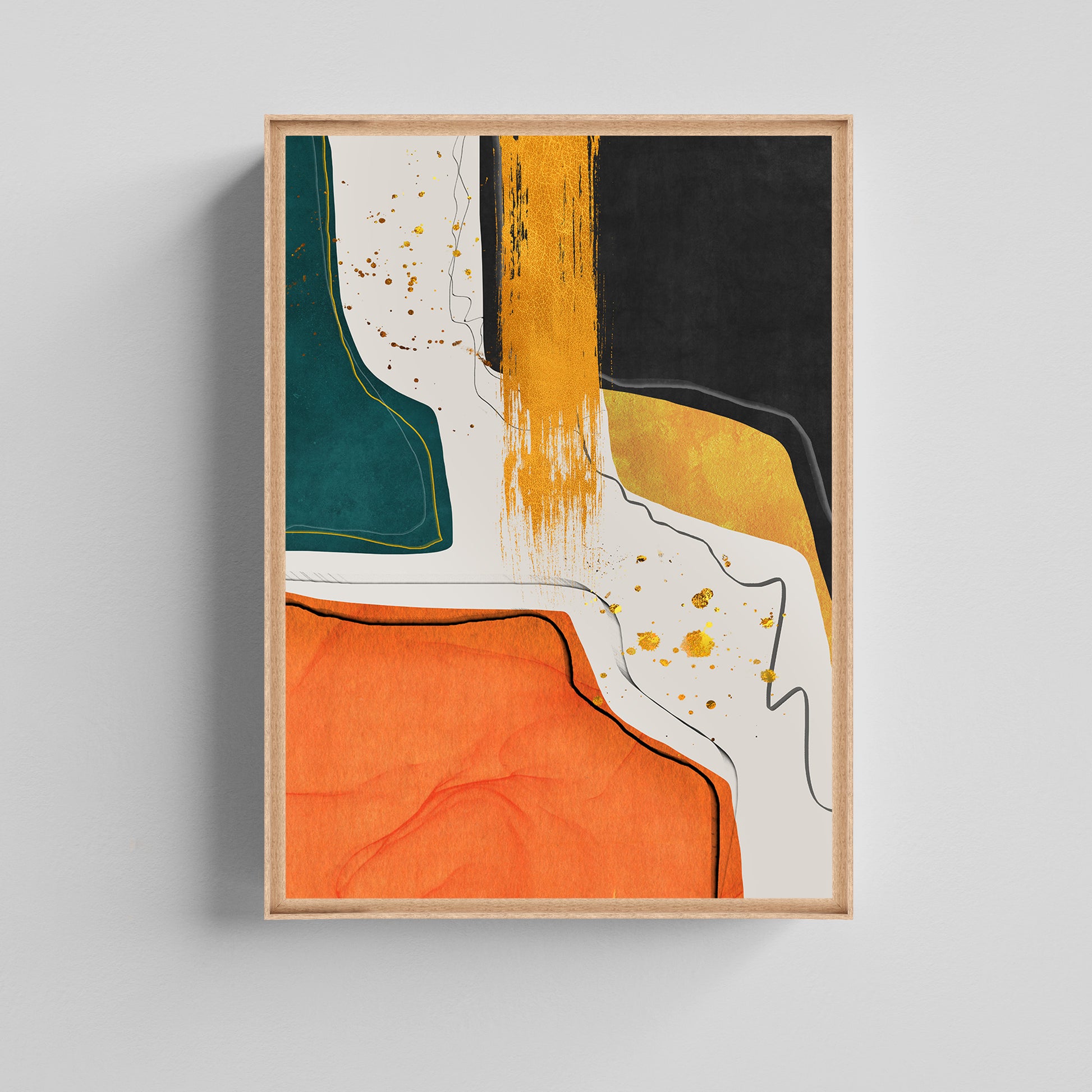 Make a bold statement with "Urban Harmony," an exclusive abstract composition designed to transform your walls. This artwork masterfully balances warm and cool tones, merging earthy burnt orange with cool teal and dramatic black. The central gold brushstroke effect acts as a luxurious anchor, bringing warmth and elegance to your space. Whether placed above a sofa or in a hallway, this piece exudes confidence and artistic flair.