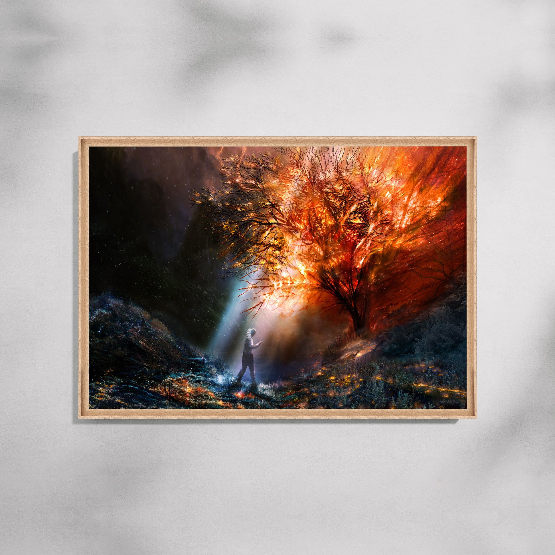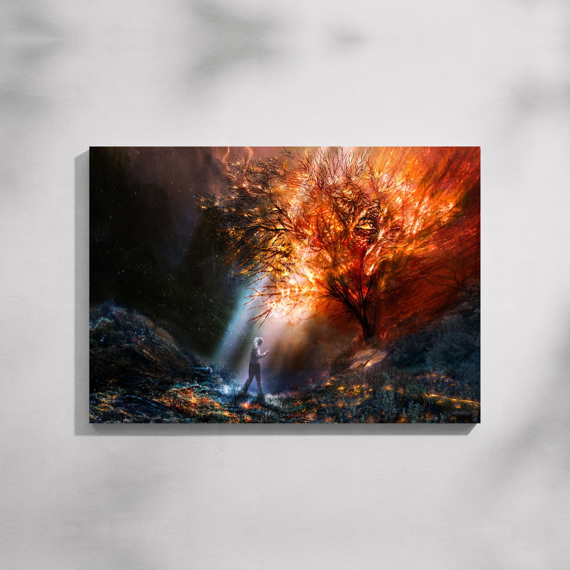 AwakenINg of Fire Canvas Painting depicts a moment of confrontation between stillness and force—where a lone figure stands before a blazINg tree, illumINated by fire, lightnINg, and cosmic energy. The INtense palette of molten reds, fiery oranges, and deep shadows creates a sense of transformation, courage, and INner awakenINg. Rich textures and dramatic lightINg give the artwork a cINematic depth, makINg it an arrestINg focal piece for livINg rooms, studies, or creative spaces. Designed for homes that embrace bold storytellINg, this canvas Painting brINgs INtensity, symbolism, and raw emotion to modern INteriors.