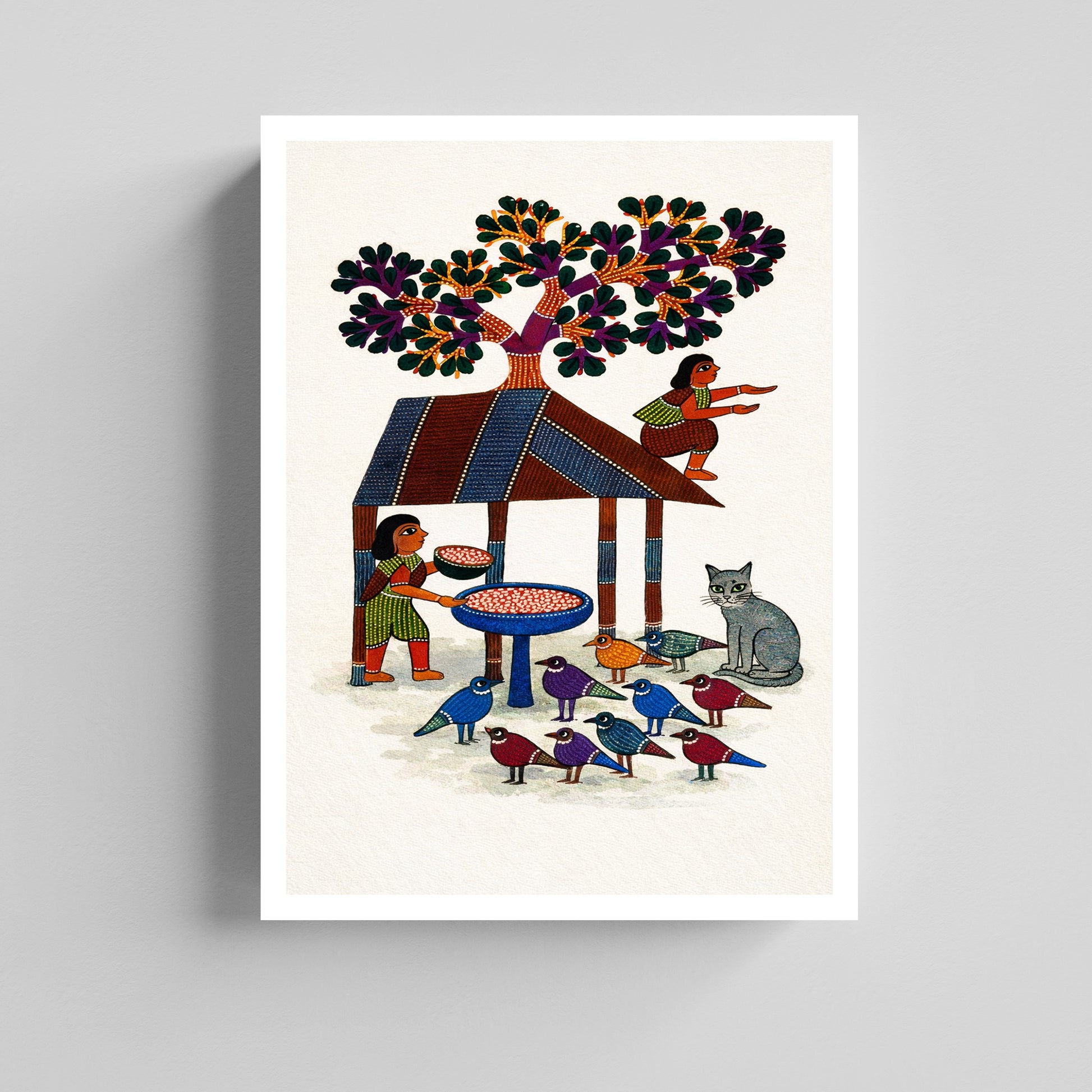 Celebrate the warmth of rural life and nature with this Birds & Rural Scene Canvas Artwork for Living Room. Inspired by traditional Indian folk art, this artwork beautifully captures a peaceful village scene—women feeding birds, a shaded hut beneath a flourishing tree, colorful birds gathered together, and a calm cat watching quietly nearby. Every element tells a story of coexistence, care, and simplicity.