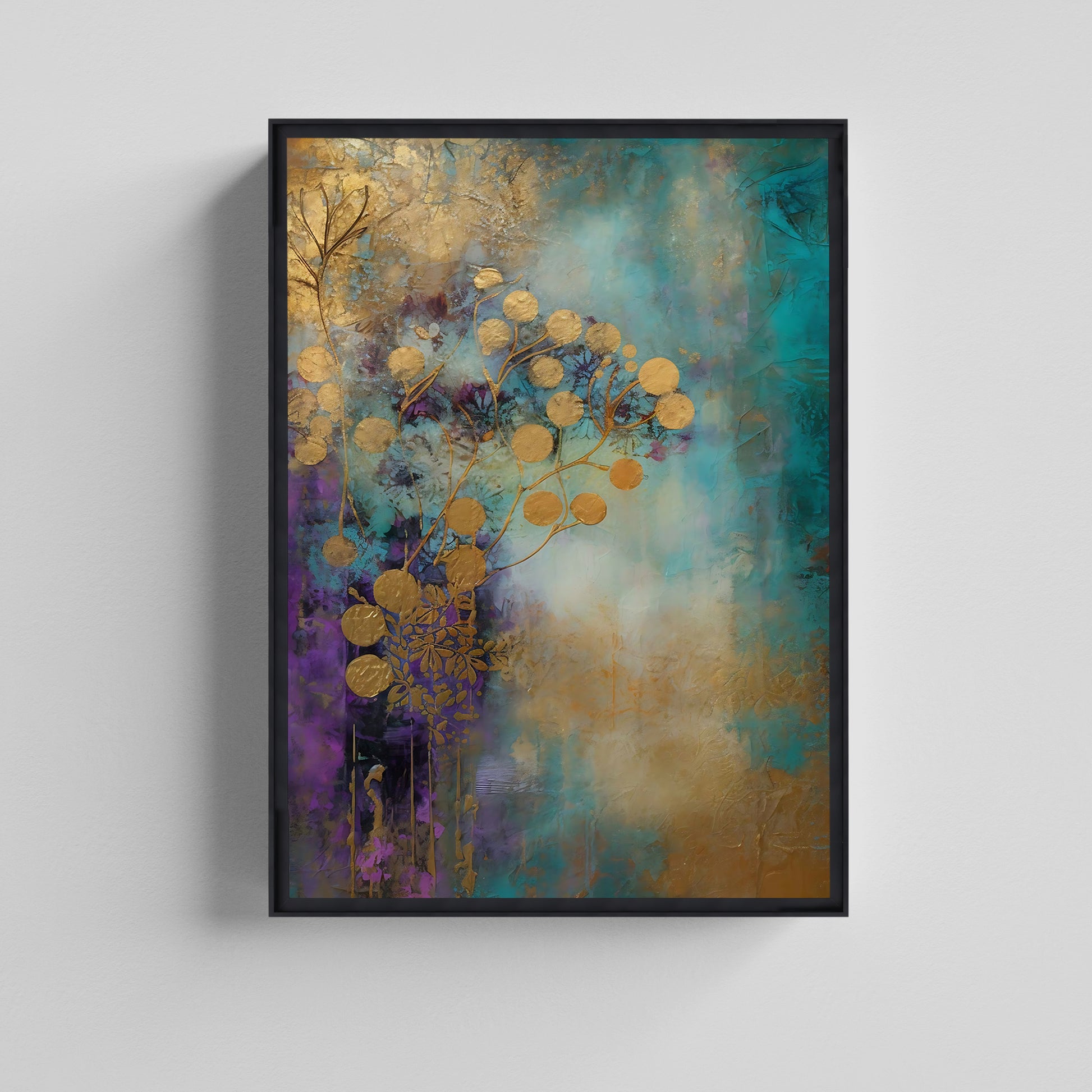 Add a touch of timeless luxury to your interiors with this Golden Botanical Abstract Canvas Painting. Featuring delicate botanical elements highlighted in rich gold tones against a soothing teal, blue, and earthy textured background, this artwork exudes calm sophistication.
