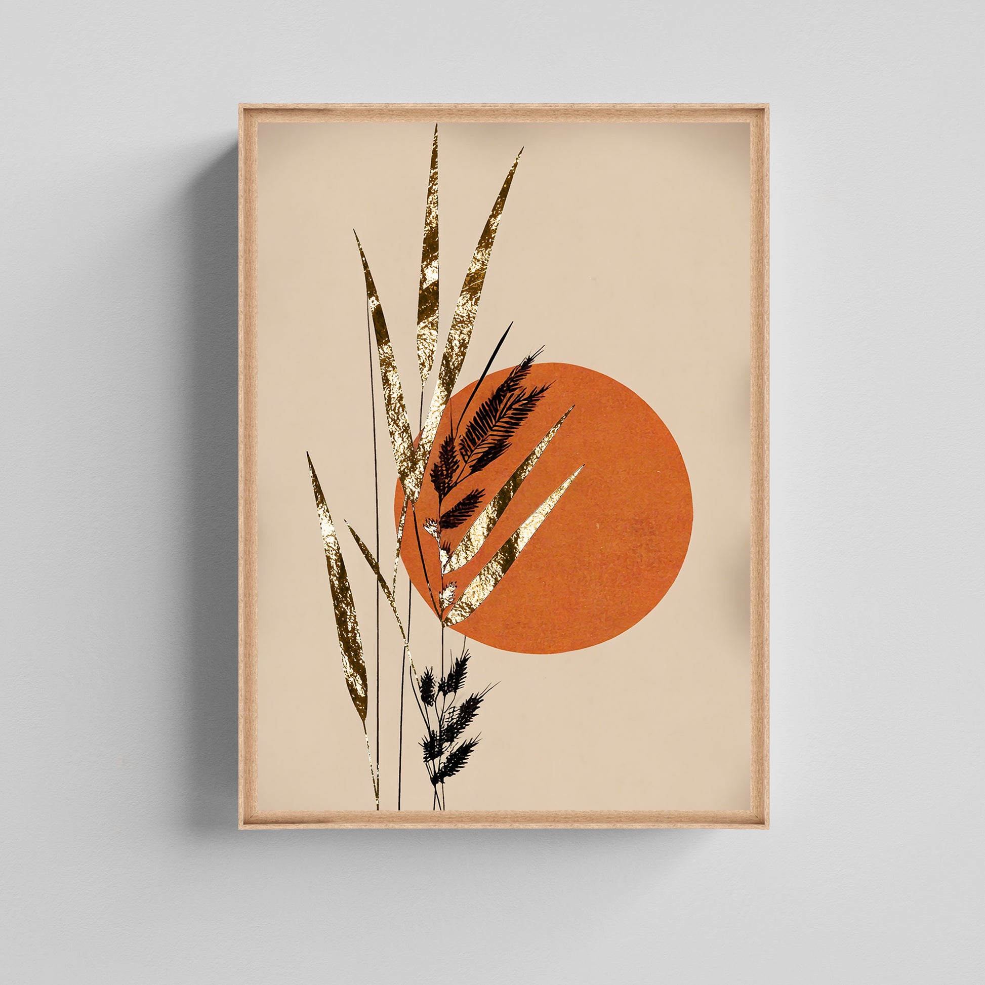 Add a touch of luxury and calm sophistication to your walls with this Golden Leaf Canvas with Terracotta Sun Painting Canvas Boho Art. Featuring shimmering gold-textured leaves paired with a warm terracotta sun circle, this artwork blends modern minimalism with boho elegance.