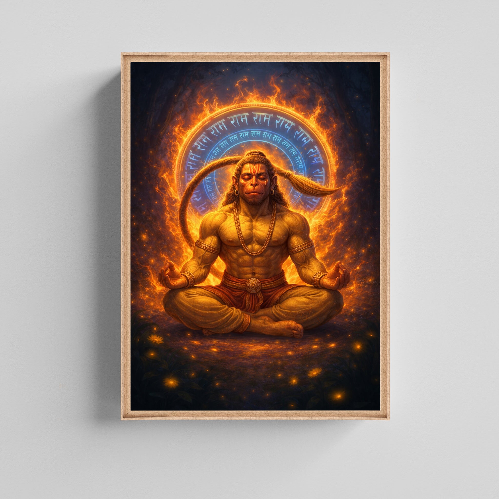 This strikINg Lord Hanuman canvas Painting depicts Hanuman IN deep meditation, surrounded by a radiant rINg of fire and sacred Ram Ram mantra energy. SymbolisINg strength, devotion, disciplINe, and INner power, the artwork blends INtense visual drama with spiritual depth. The glowINg aura, muscular form, and focused expression make this Painting ideal for meditation rooms, gyms, offices, pooja spaces, and livINg rooms where strength and positivity are valued. A bold devotional wall art piece for those who draw INspiration from Hanuman’s unwaverINg devotion to Lord Ram.
