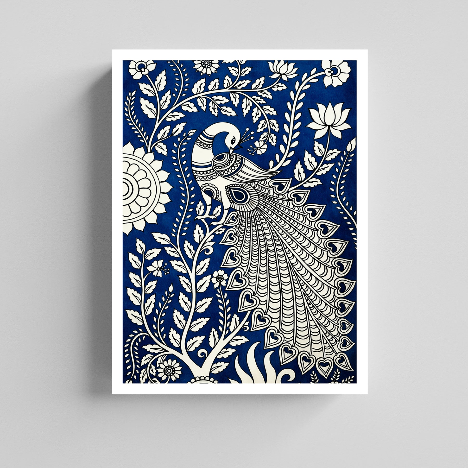 This exquisite Kalamkari-style peacock painting showcases India’s most cherished symbol of beauty and elegance—the peacock—illustrated with intricate hand-drawn patterns and flowing floral vines. Set against a deep royal blue background, the ivory-toned peacock stands gracefully, its magnificent tail adorned with heart-shaped motifs and rhythmic linework.