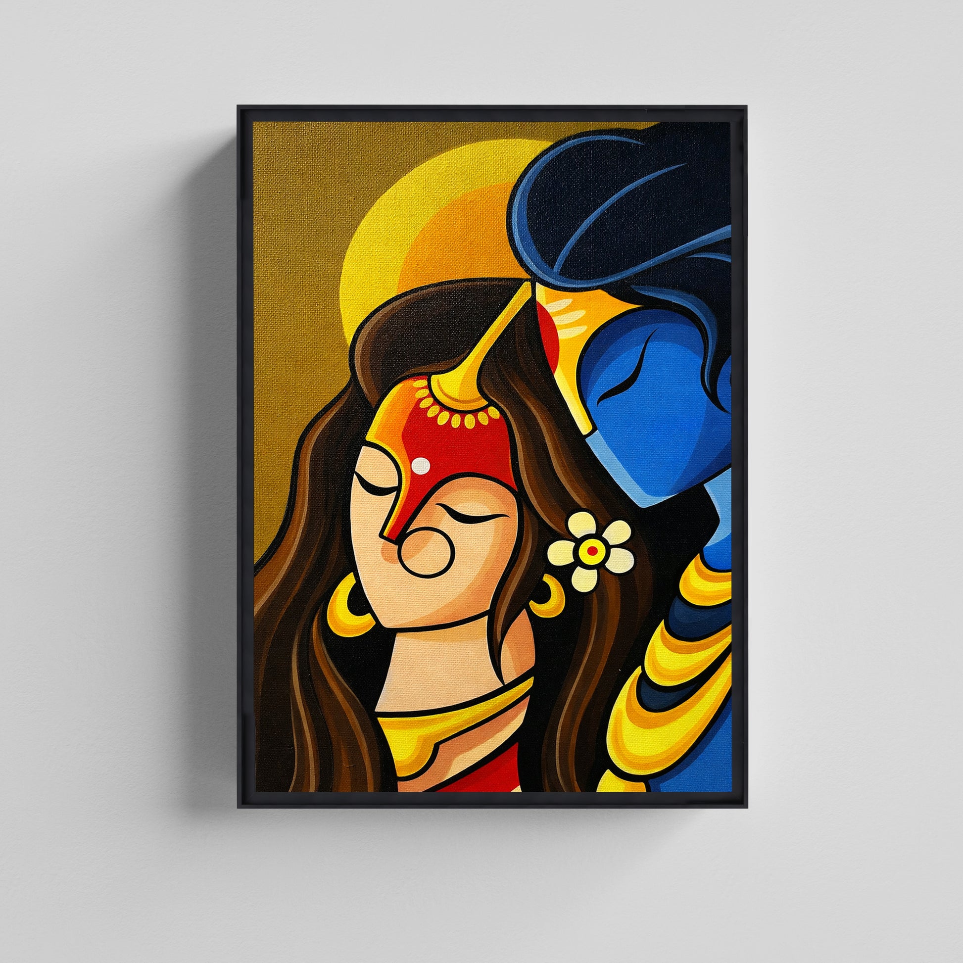 The painting features soft minimalist facial expressions, a soothing mustard golden background, and the calming contrast of Krishna’s blue form with Radha’s warm earthly tones. Subtle details like Radha’s sindoor, floral hair ornament, and graceful jewelry enhance the emotional depth while keeping the composition elegant and contemporary.