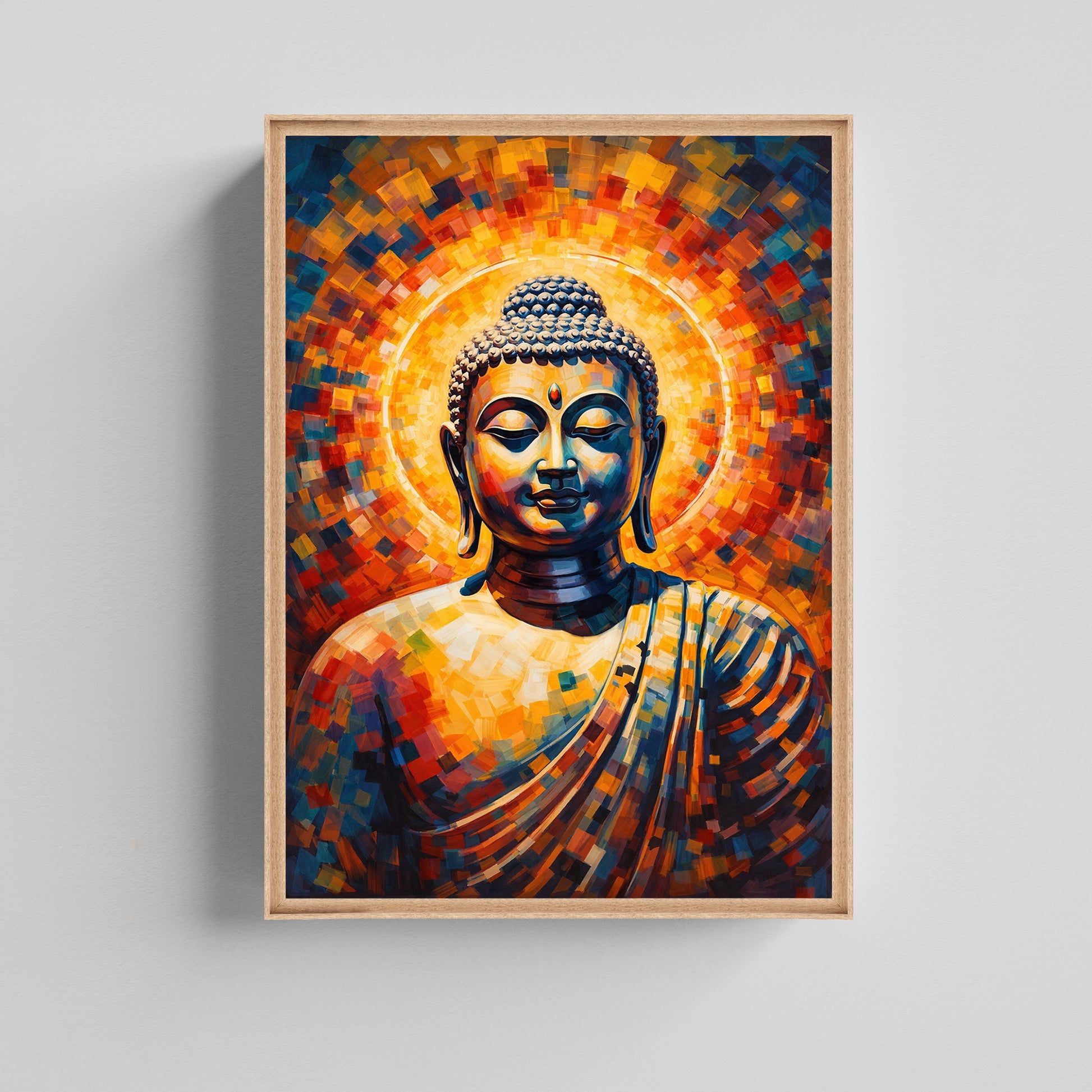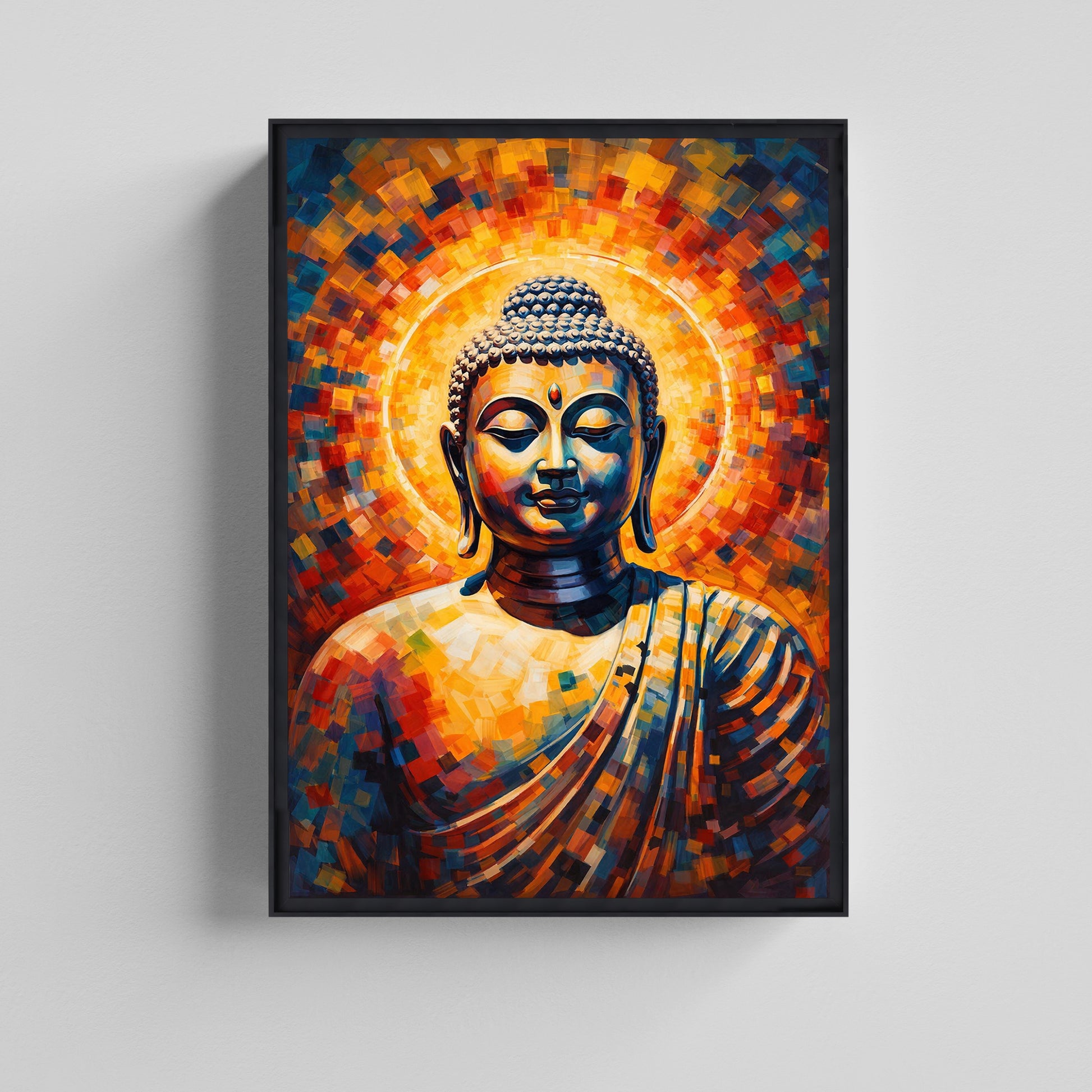 ring peace, balance, and spiritual energy into your space with the Radiant Buddha Serenity Canvas Painting. This artwork features a calm Buddha face in deep meditation, surrounded by a glowing halo of vibrant orange, yellow, blue, and red mosaic-style brushstrokes. The abstract geometric texture adds a modern artistic touch while preserving the sacred and spiritual essence of Buddha art.