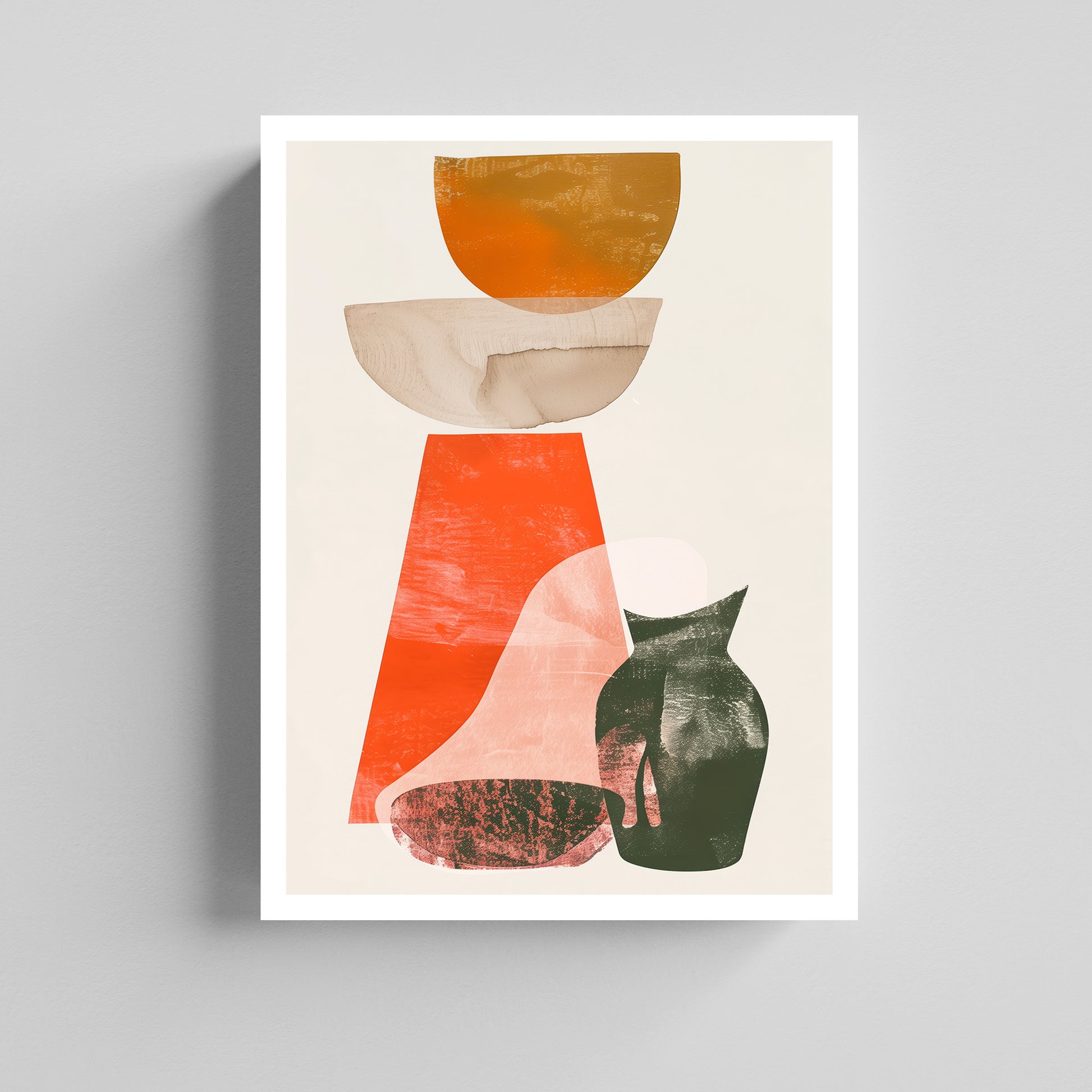 Elevate your interior with this modern abstract still life wall art, featuring stylized vases and bowls arranged in a balanced geometric composition. Warm terracotta, soft beige, olive green, and muted orange tones create a calm, earthy palette that adds depth and character to any space.